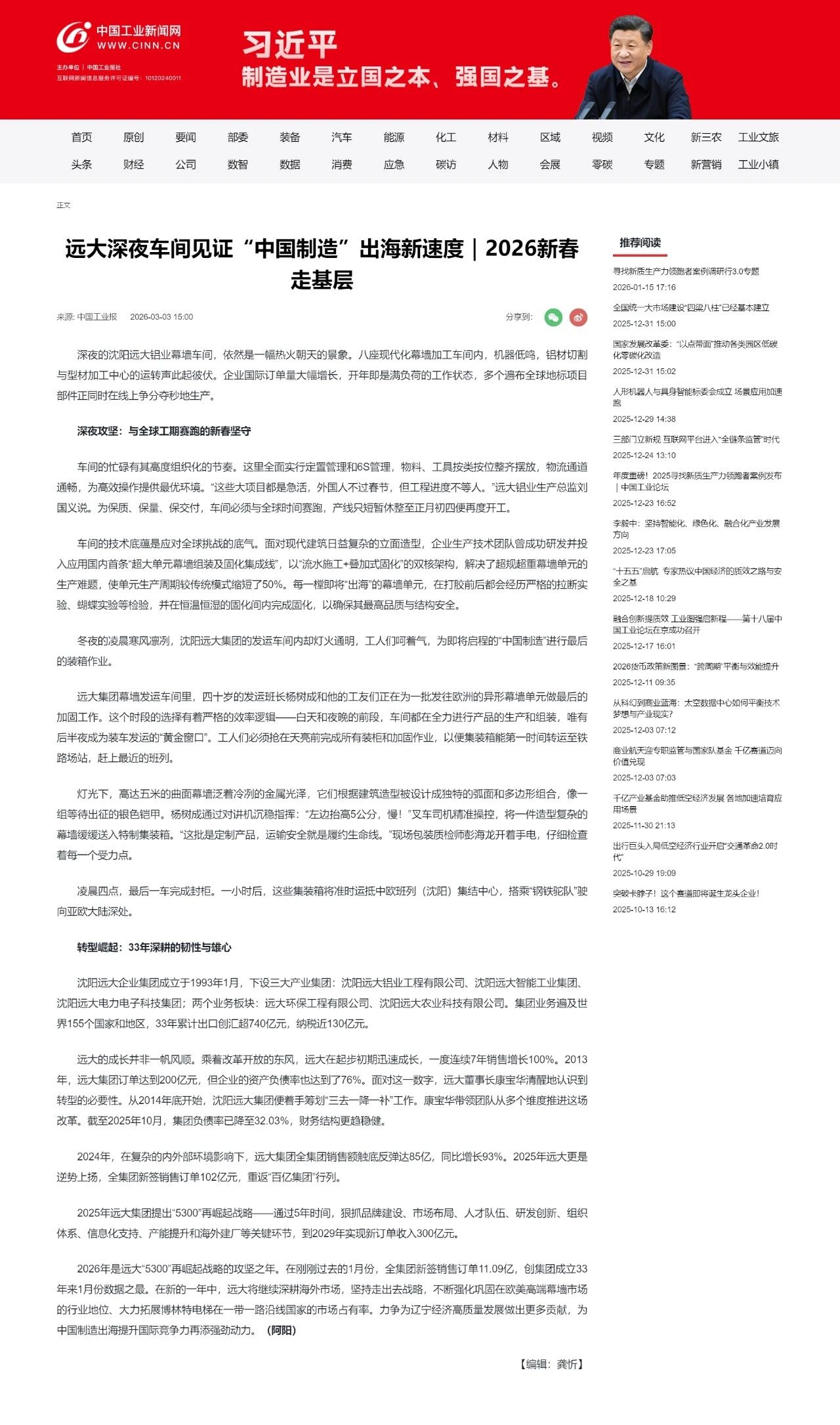 央级媒体《中国工业报》聚焦沈阳远大:深夜车间灯火通明,国际订单饱满,产线满负荷运转。凭借核心技术与高效管理,工人们抢抓工期,异形幕墙等高端产品经严格质检后搭乘中欧班列出海。2026 年开年订单创新高,在 “5300” 战略引领下,“中国制造” 扬帆全球。