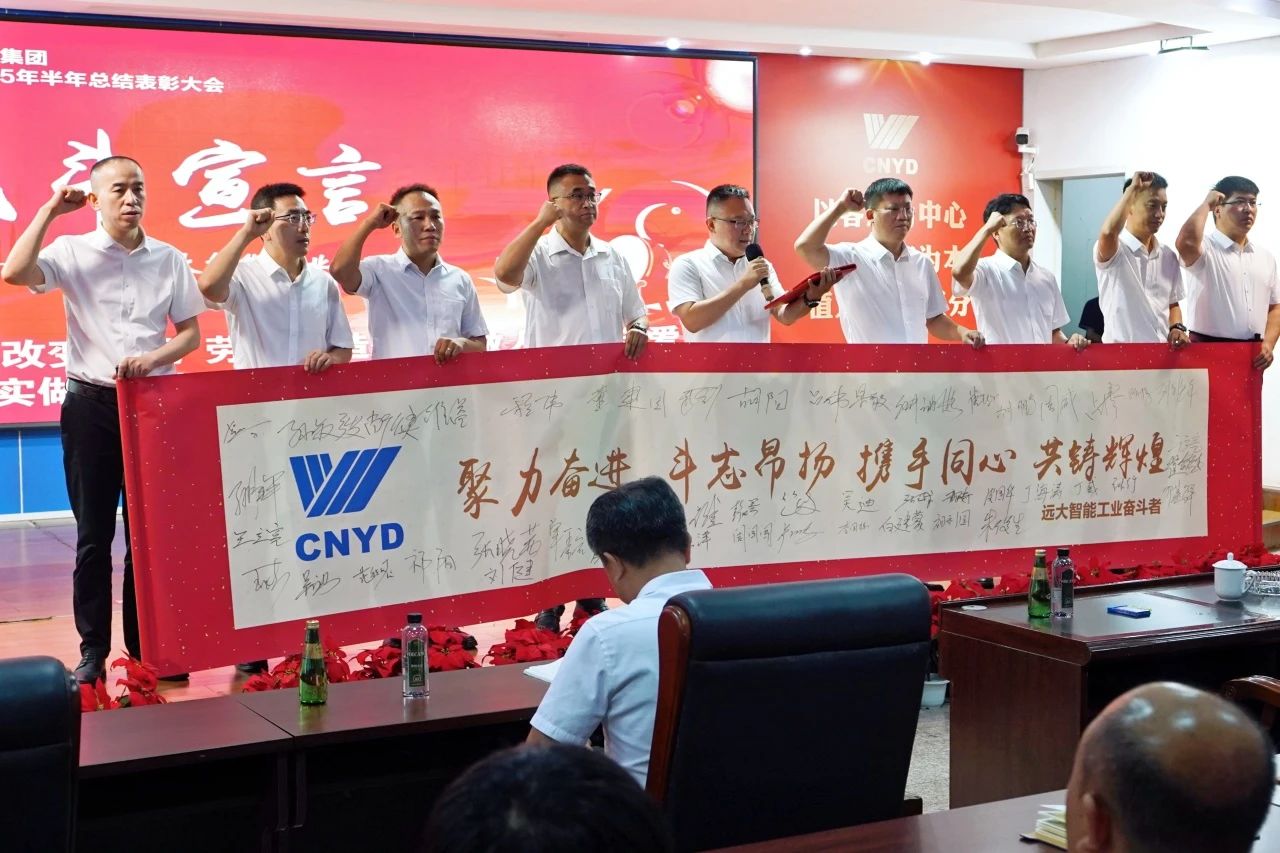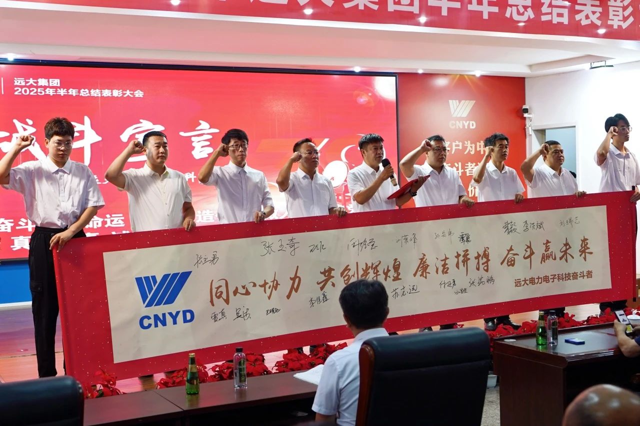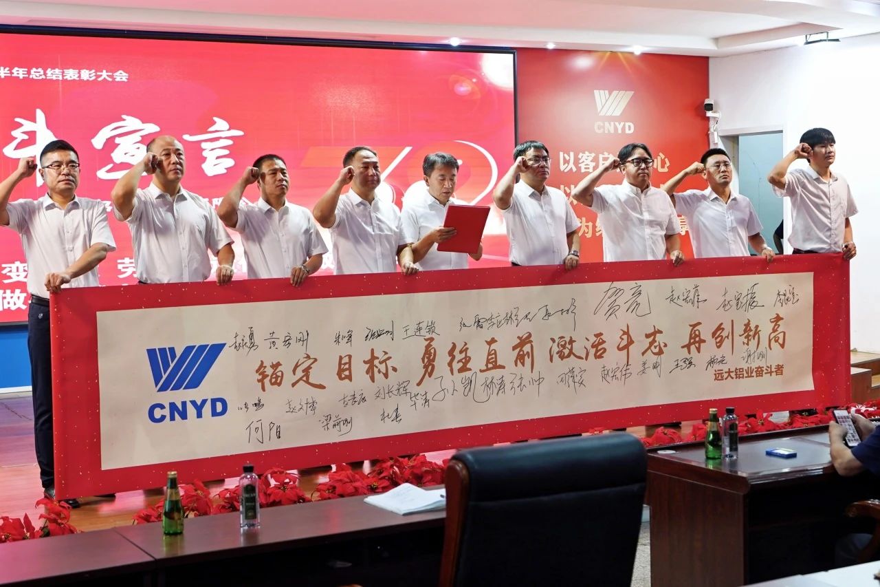 表彰是肯定,更是出征的动员令。铝业、智能工业、电力电子的高管团队依次登台,他们在奋斗横幅上签下名字,领读下半年战斗宣言。铿锵誓言回荡会场,展现了远大人坚定不移完成目标任务的决心和勇气,为下半年的冲刺吹响了冲锋的号角。