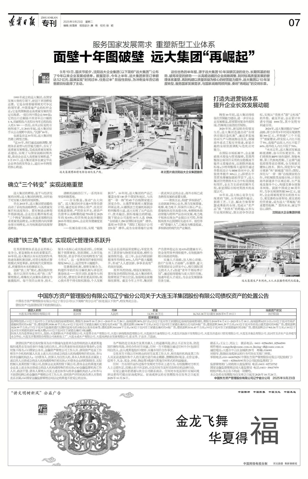 9月23日,《辽宁日报》重点报道了沈阳远大企业集团10年转型“再崛起”的实践成果。其中,远大今年上半年新签订单额达52亿元,资产负债率降至32.03%,海外业务覆盖140多个国家和地区,以扎实转型成果致敬祖国华诞,生动诠释了民营企业深耕主业、对标高质量发展、与国家战略同频共振的奋进之路。
